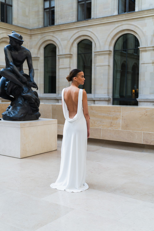 Une robe à la fois minimaliste chic et audacieuse, pensée pour la mariée contemporaine qui ose la simplicité, sans renoncer au caractère.